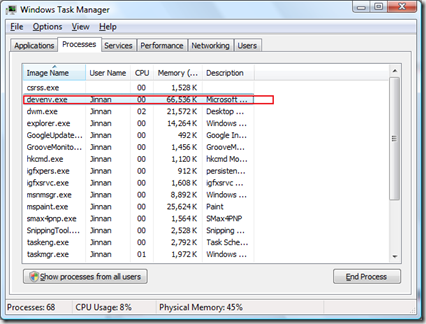 VS2010 Beta 1发布还一阵了,相信很多人已经开始尝鲜了。不知道大家有没有遇到过这样的问题:当打开VS2010的时候,出现这样一个初始化界面。 但是几秒钟之后,初始化界面消失,但是VS2010的UI界面并没有出现。但是通过Task Manager查 ...