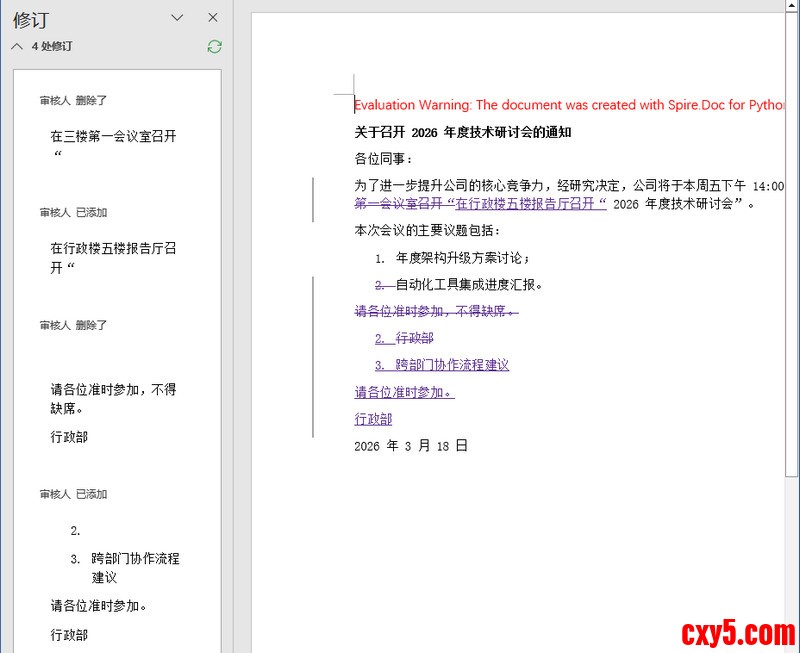 在处理合同审批、技术文档迭代或公文修订时,手动核对不同版本间的修改和差异较为耗时。即便 Word 自带比较功能,频繁的点击和文件切换也难以满足现代化办公对工作效率的要求。利用 Python 配合 Spire.Doc 库,我们可以将这种重复性的手 ...