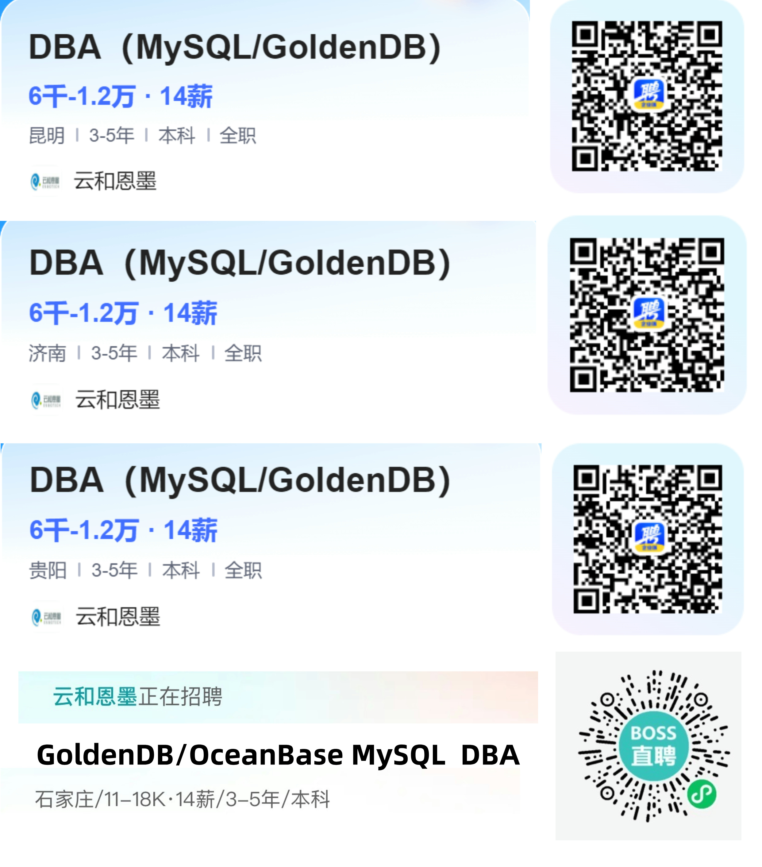 急招!【Base 石家庄 / 济南 / 昆明 / 贵阳】云和恩墨 - GoldenDB/MySQL DBA