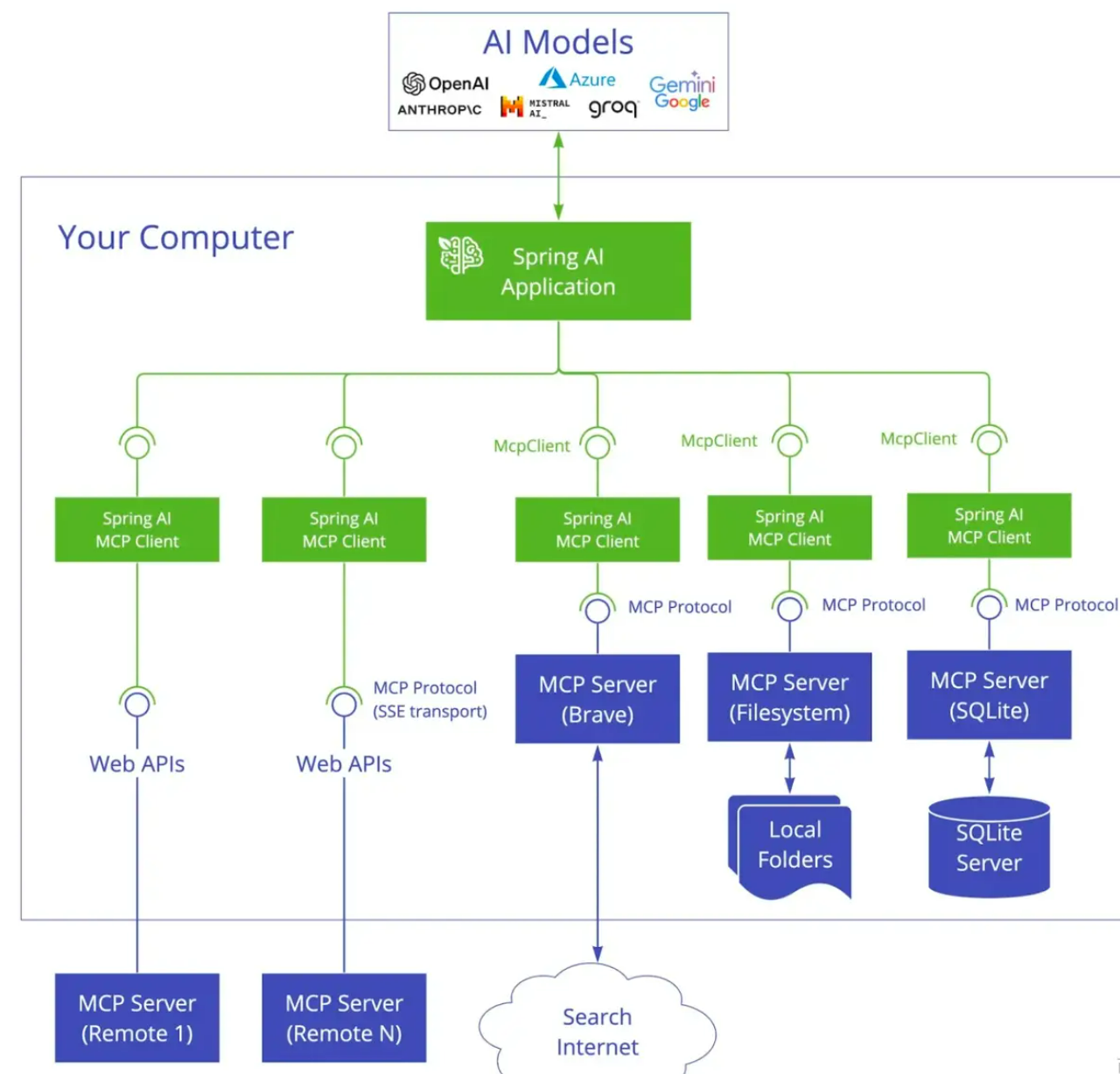 SpringAI MCP介绍 Spring AI MCP 为模型上下文协议提供 Java 和Spring 框架集成、它使 SpringAI 应用程序能够通过标准化的接口与不同的数据源和工是进行交互,支持同步和异步通信模式。整体架构如下: Spring Al 通过以下 Spring Boot ...